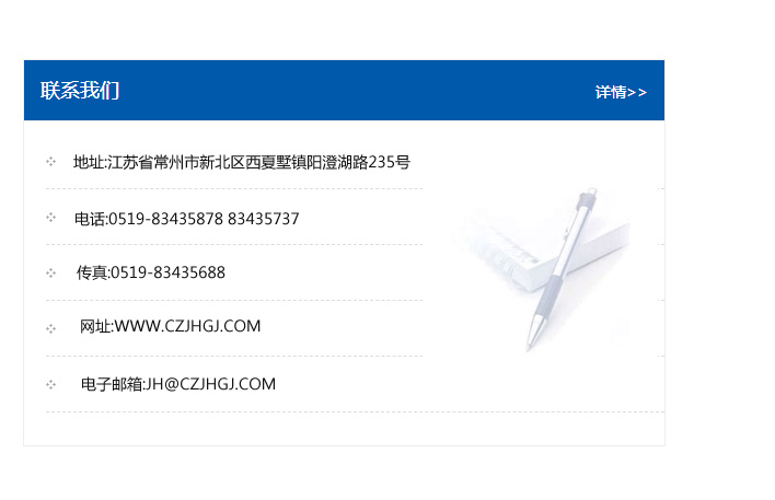 地址:常州市新北區友邦商務大廈1幢16、17層  電話:0519-85101652  傳真:0519-85112595  郵編:213022  網址:www_cz-jiayue_cn.bqlchuangmei.com  郵箱:xiajifengaa@163.com
